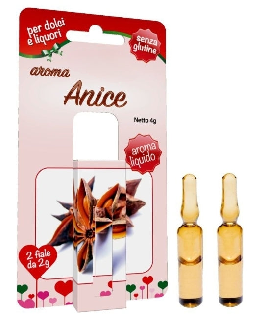 Liquid aroma with aniseed flavour. Gluten-free. The package includes 2 vials of 2 grams. Instructions and doses of use: Shake the product before use. Each single vial flavours approximately 2 kg