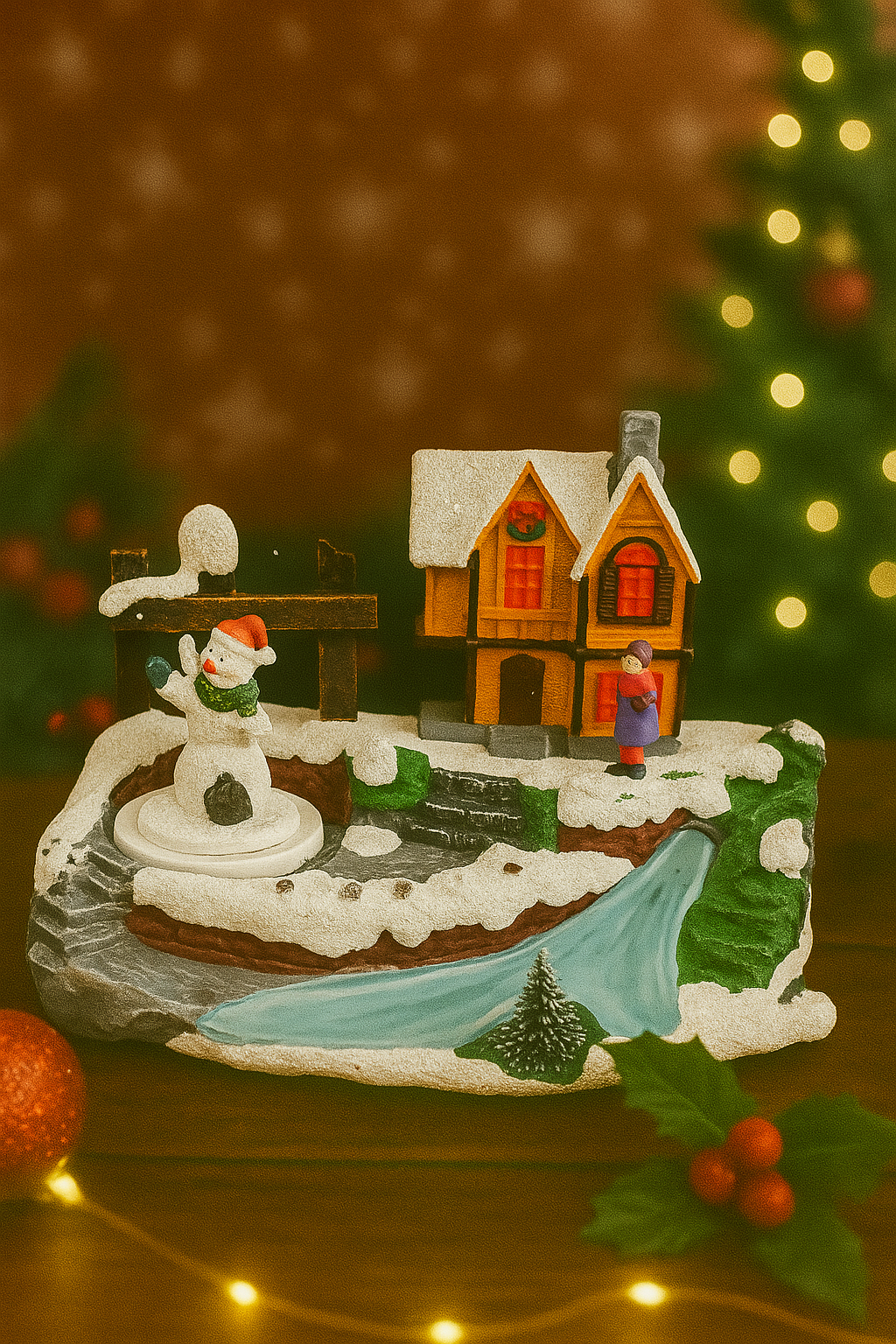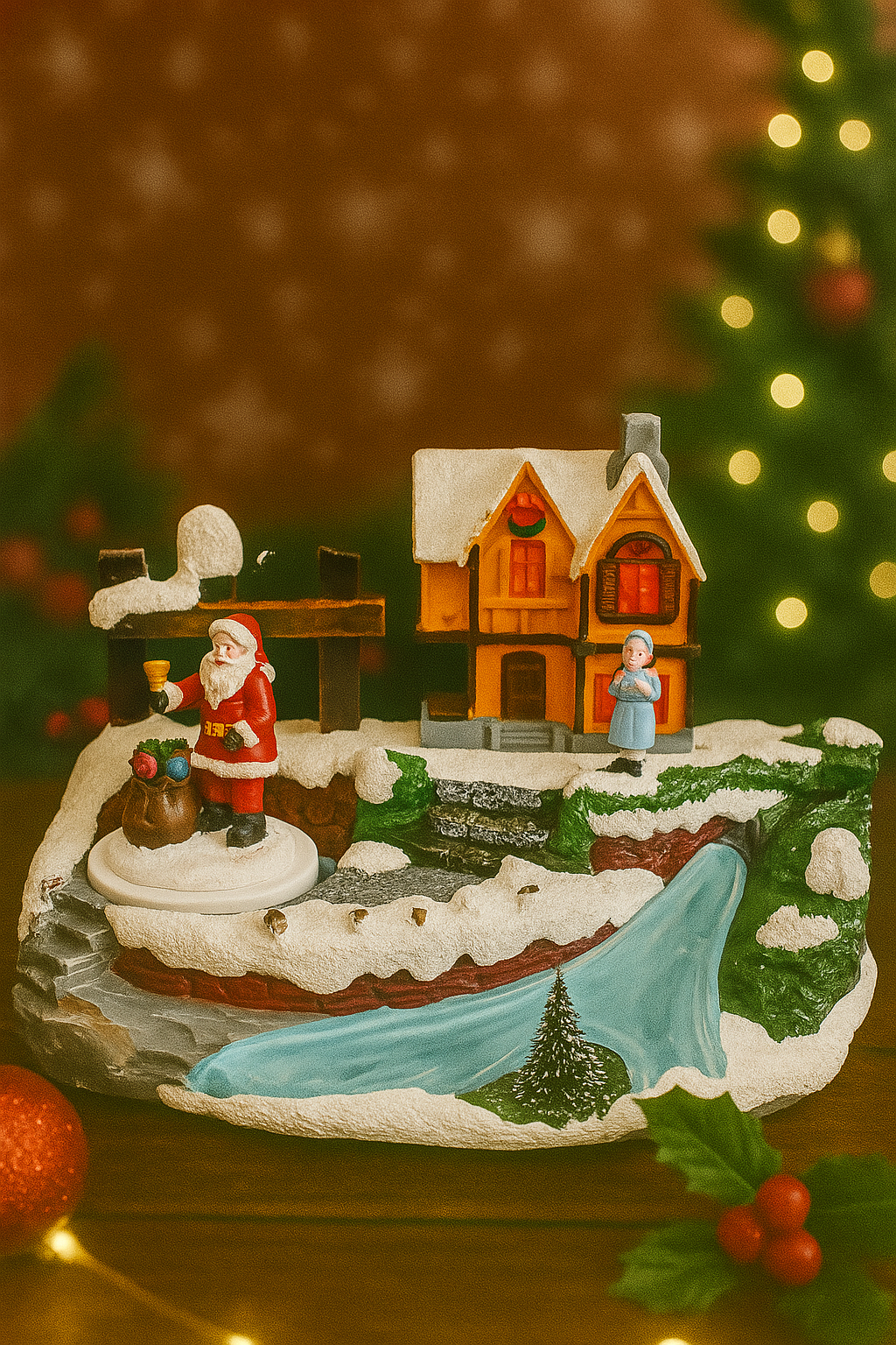 Incantevole giostrina natalizia con paesaggio innevato, personaggi in movimento, luci e melodia festiva. La scena include una casetta illuminata, un ruscello ghiacciato e personaggi che ruotano creando un’atmosfera magica. Funziona a batterie ed è perfetta da esporre su tavolini, mensole o come punto luce natalizio scenografico. non è possibile scegliere il modello.