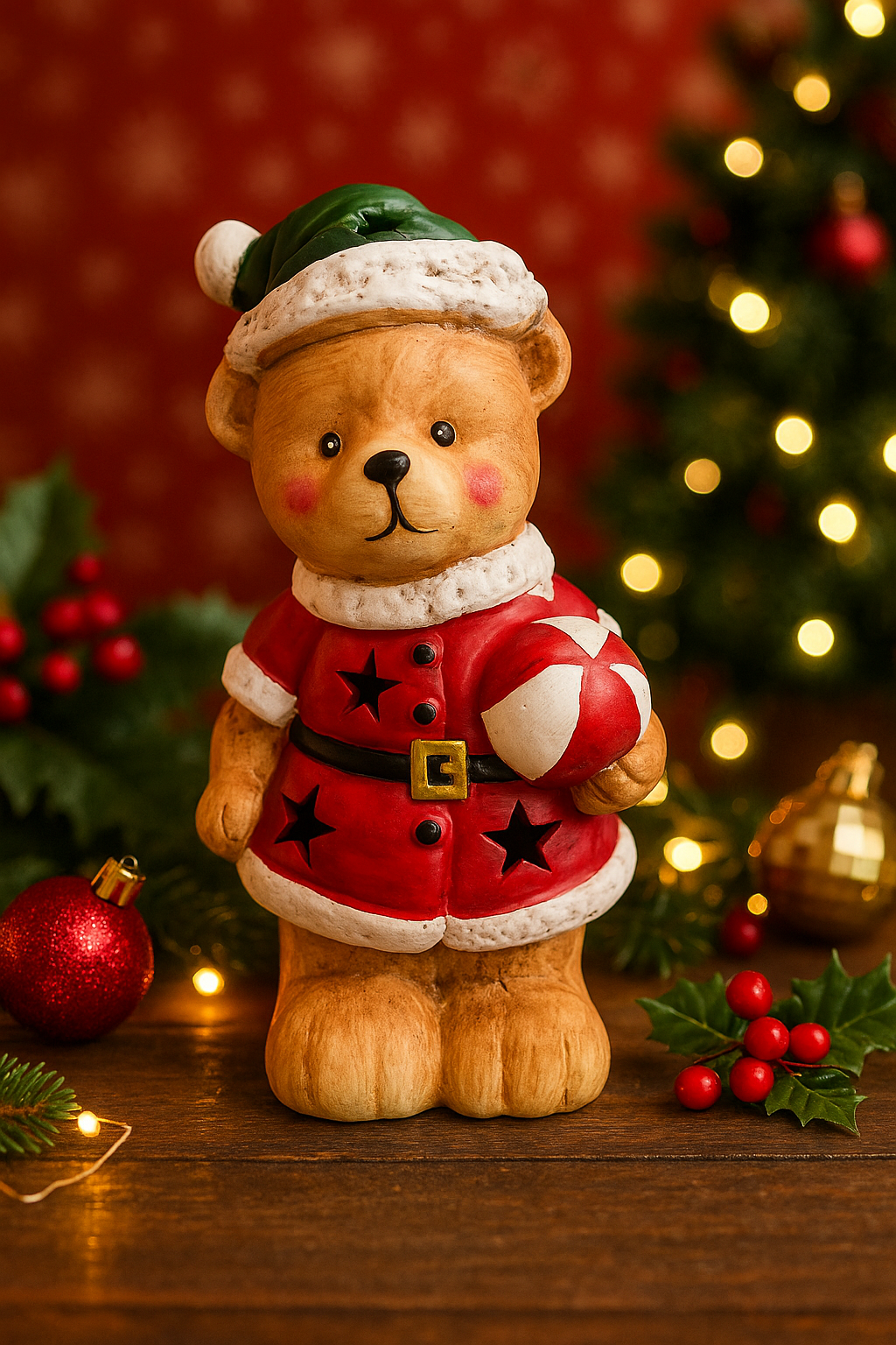 Aggiungi un tocco di magia al tuo Natale con questo dolcissimo orsetto decorativo in ceramica, vestito da Babbo Natale e curato in ogni dettaglio. Con i suoi colori caldi, il cappellino verde e i dettagli dipinti a mano, è l’accessorio ideale per creare un’atmosfera accogliente e festosa in casa.
