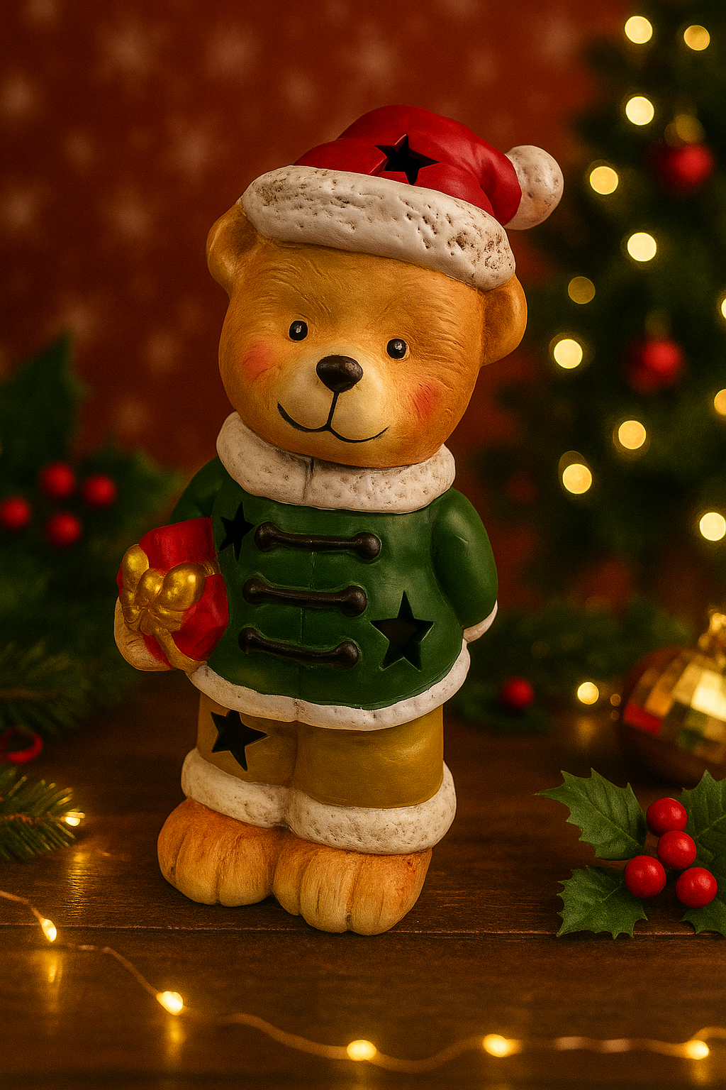 Dolcissima decorazione natalizia in ceramica, perfetta per creare atmosfera nelle feste. L’orsetto indossa un cappellino rosso, un caldo cappottino verde e tiene in mano un regalo dorato. I dettagli dipinti a mano e le stelle intagliate sul corpo permettono alla luce interna di diffondersi creando un effetto caldo e accogliente. Ideale da esporre su mensole, tavolini o come idea regalo speciale.