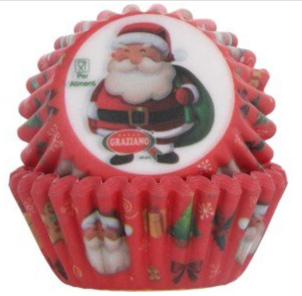 Details: Colourful paper baking cups, decorated with the icons of Santa Claus and