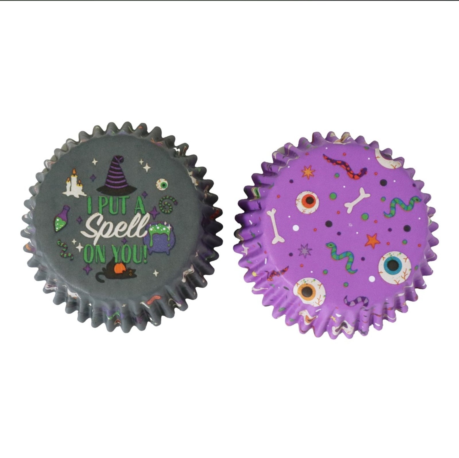 Pacco di 60 pirottini, ognuno misura 52 x 30mm. Include 2 design x 30 rivestimenti da forno ciascuno, con motivi di gatti, occhi, pozioni e altro ancora.