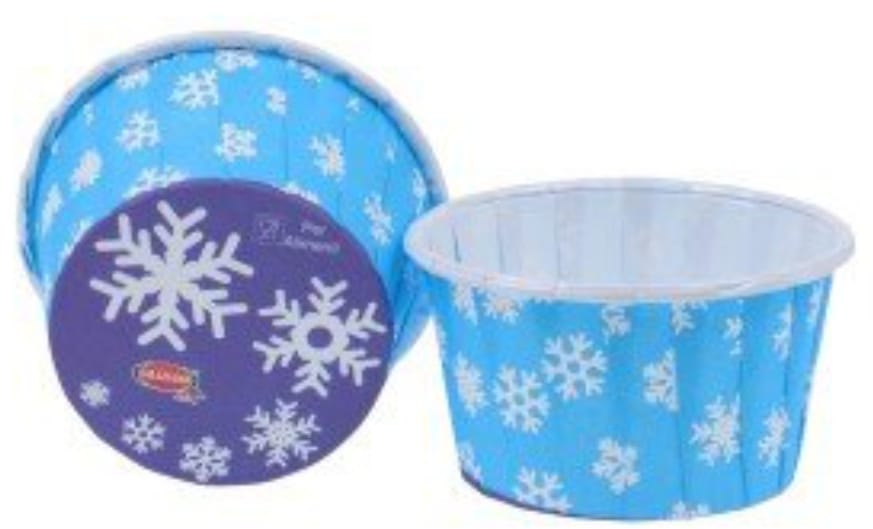 Details: Blue paper baking cups, decorated with snowflakes. On the bottom, of