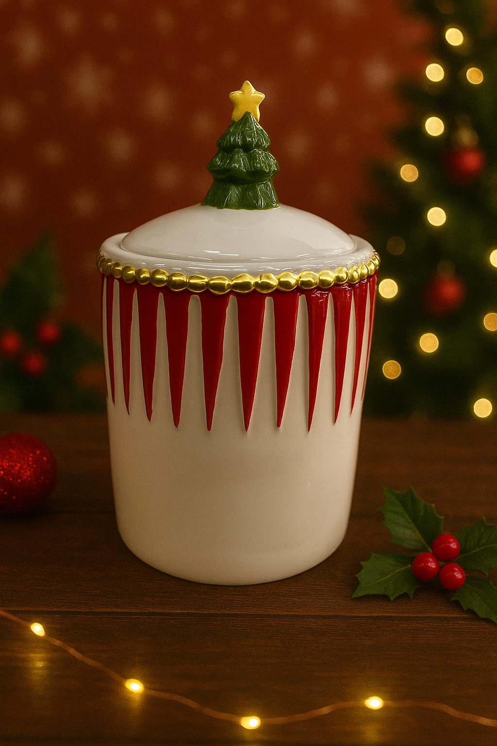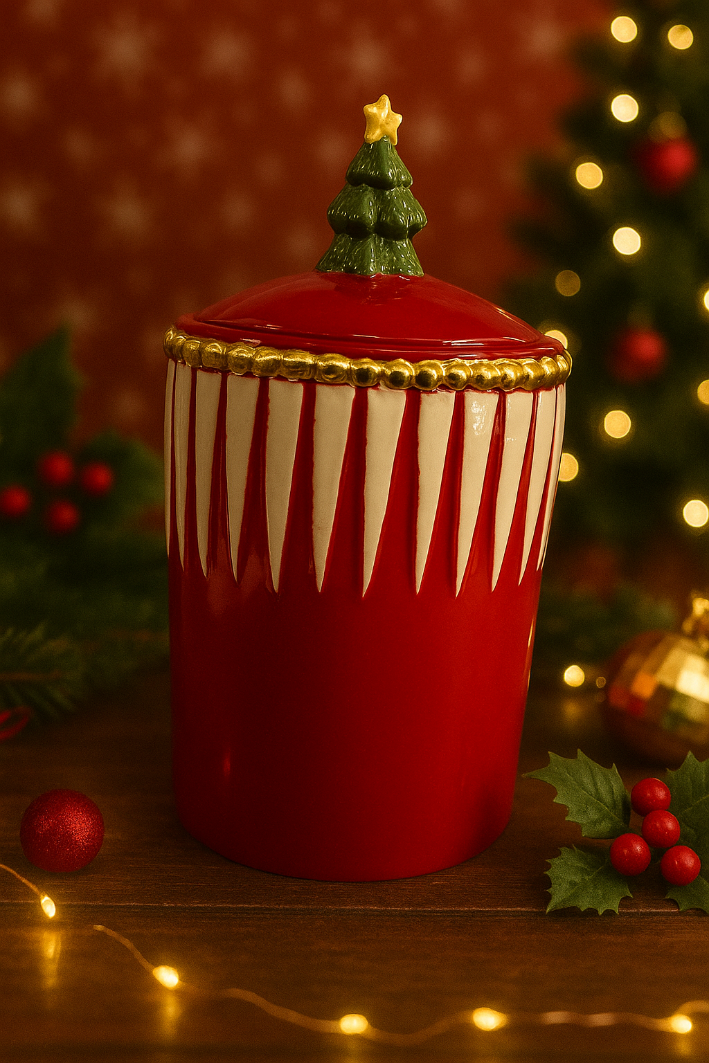 Elegante porta biscotti natalizio in ceramica, disponibile in due varianti colore: rosso o bianco. Il design a cilindro è impreziosito da dettagli dorati e dal coperchio decorato con un alberello di Natale con stellina dorata. Perfetto per conservare biscotti, dolcetti o per essere utilizzato come elemento decorativo nelle feste. Un accessorio funzionale e allo stesso tempo decorativo, ideale anche come idea regalo.