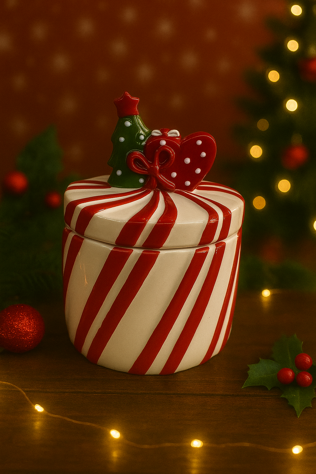 Delizioso porta cioccolatini natalizio in ceramica, decorato con eleganti strisce rosse e un coperchio arricchito da un alberello e cuoricino in stile festivo. Ideale per contenere cioccolatini, caramelle o piccoli dolci, aggiunge un tocco di magia e colore alla tavola delle feste. Perfetto anche come idea regalo elegante e originale.