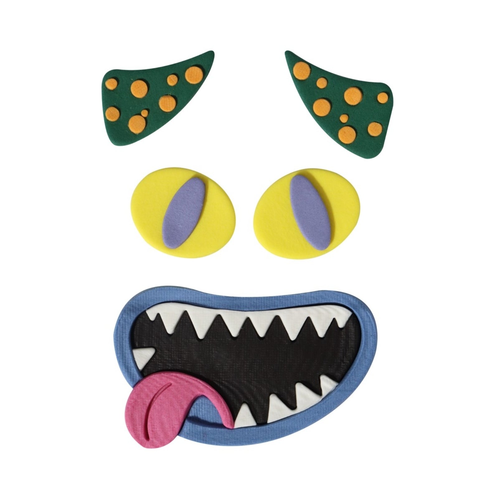 Il set include 5 pezzi per creare il volto di un mostro: corna, una bocca e un paio di occhi. Dimensionato idealmente per adattarsi a torte da 6 a 8 pollici.